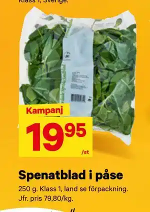 Denna kampanj är tillgänglig i olika butiker, se alla produkter för att få det billigaste Spenatblad i påse. Om du vill ta reda på om denna produkt har en bättre rabatt i en annan butik, kolla kategorin 'Matbutiker'. Du kanske också tycker att dessa erbjudanden är intressanta: FÄRSKPOTATIS I PÅSE, Äpple i Påse & Morötter i påse.