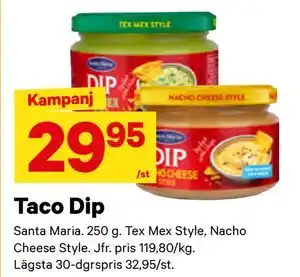 Denna kampanj är tillgänglig i olika butiker, se alla produkter för att få det billigaste Taco Dip. Om du vill ta reda på om denna produkt har en bättre rabatt i en annan butik, kolla kategorin 'Matbutiker'. Du kanske också tycker att dessa erbjudanden är intressanta: DIP, Dip & KiMs Dip Mix.