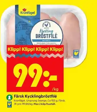 Kronfågel. Ursprung Sverige. Ca Färsk. Jfr pris 99:00/kg. Max 2 köp/hushåll.