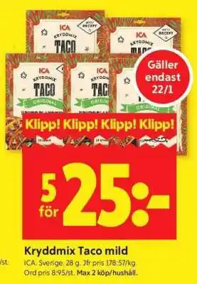 Nu på erbjudande hos ICA Supermarket: Kryddmix Taco mild ✅ Giltigt från 19-01 till 25-01.