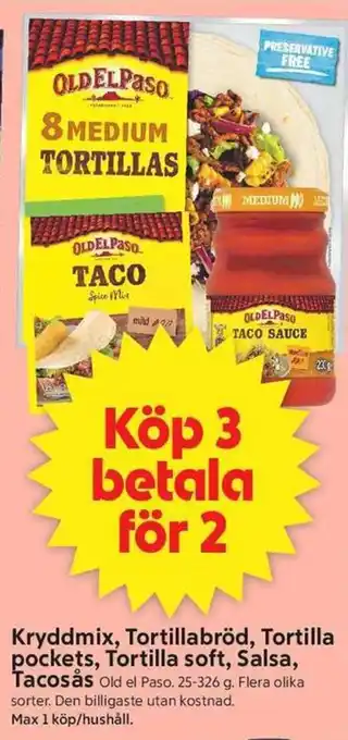 OLD EL PASO Kryddmix, Tortillabröd, Tortilla pockets, Tortilla soft, Salsa, Tacosås erbjudande hos ICA Supermarket