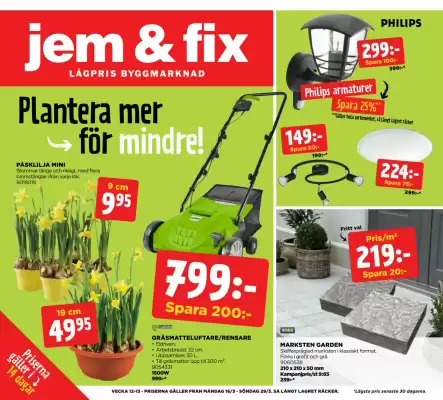 Varje vecka publiceras ett nytt reklamblad från Bygg hos Jem&Fix. På den här sidan hittar du alltid det senaste <b>Jem&Fix reklamblad</b> som gäller från 16-03-2026 till 30-03-2026. Du får snabbt överblick över det lokala reklambladet i %city% och vet när nästa finns tillgängligt.