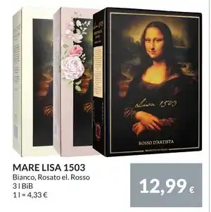 Denna kampanj är tillgänglig i olika butiker, se alla produkter för att få det billigaste MARE LISA 1503, EUR 12.99. Om du vill ta reda på om denna produkt har en bättre rabatt i en annan butik, kolla kategorin 'Matbutiker'. Du kanske också tycker att dessa erbjudanden är intressanta: Mare Lisa 1503 Bianco, Rosato. eller. Rosso d‘Artista, EUR 9.99, Lisa 1503, EUR 9.99 & Lisa 1503, EUR 9.99.