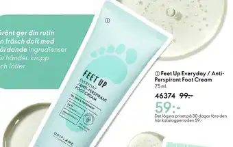 Du hittar priset för Feet Up Everyday / Anti- Perspirant Foot Cream längst upp på sidan, tillsammans med de datum då erbjudandet är aktuellt. Du kan också kontrollera priset i det aktuella Oriflame reklamblad eller på Oriflame hemsida. Kampanjerbjudanden ser till så du kan köpa Oriflame-produkter till lägsta pris.