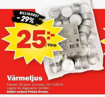 Du hittar priset för Värmeljus längst upp på sidan, tillsammans med de datum då erbjudandet är aktuellt. Du kan också kontrollera priset i det aktuella Pekås reklamblad eller på Pekås hemsida. Kampanjerbjudanden ser till så du kan köpa Pekås-produkter till lägsta pris.