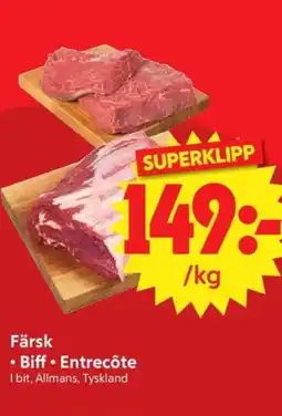 Coop Forum Färsk entrecôte/ Biff i bit erbjudaFärsk entrecôte/ Biff i bit 1 kg.Coop Forum199,00 kr23 mars 202629 mars 2026