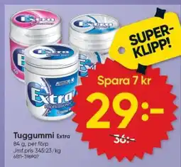 Den här veckan finns flera erbjudanden för Extra hos DollarStore och andra stora kedjor. Här hittar du exempelvis SPAR 25%, 2 för 1 på Extra Tuggummi, Tuggummi Extra och Ananas extra söt. Med filtren kan du enkelt välja förpackningstyp, innehåll eller din favoritåterförsäljare.