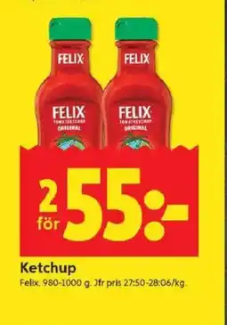 | KETCHUP Felix. 980-1000 g | ICA Kvantum | 60,00 kr | 28 april 2025 | 04 maj 2025 | |||