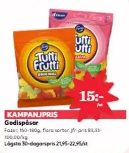 Denna vecka finns det 1 erbjudanden på Godispåsar som är giltiga. Använd filter för att hitta erbjudande baserat på din favorit eller specifik produkt. Du kan spara sökningen för att få meddelande när Godispåsar återigen finns som billig aktie.