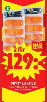 ICA Supermarket Fryst Laxfilé erbjudaFryst LaxfiléICA Supermarket129,00 kr16 februari 202622 februari 2026