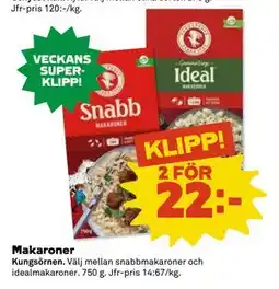 Hemköp KUNGSÖRNEN Makaroner erbjudaKUNGSÖRNEN Makaroner 750 gHemköp14,00 kr05 januari 202611 januari 2026
