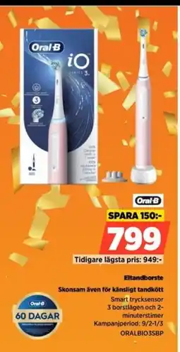 | Oral-B Eltandborste ORALBIO3SBP | Power | 949,00 kr | 799,00 kr | 150,00 kr Rabatt | 09 februari 2026 | 15 februari 2026 |