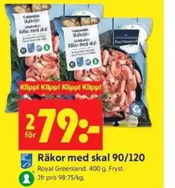 | ROYAL GREENLAND Räkor med skal 90/120 400 g | ICA Kvantum | 79,00 kr | 01 september 2025 | 07 september 2025 | |||
