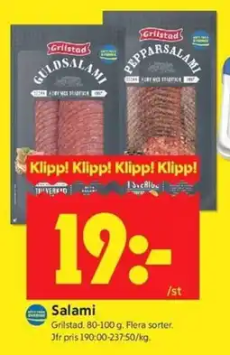 | GRILSTAD Salami 80 - 100 g | ICA Kvantum | 19,00 kr | 20 april 2026 | 26 april 2026 | |||