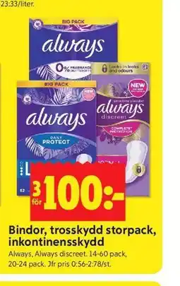 ICA Kvantum Always Bindor, trosskydd storpack, inkontinensskydd erbjuda